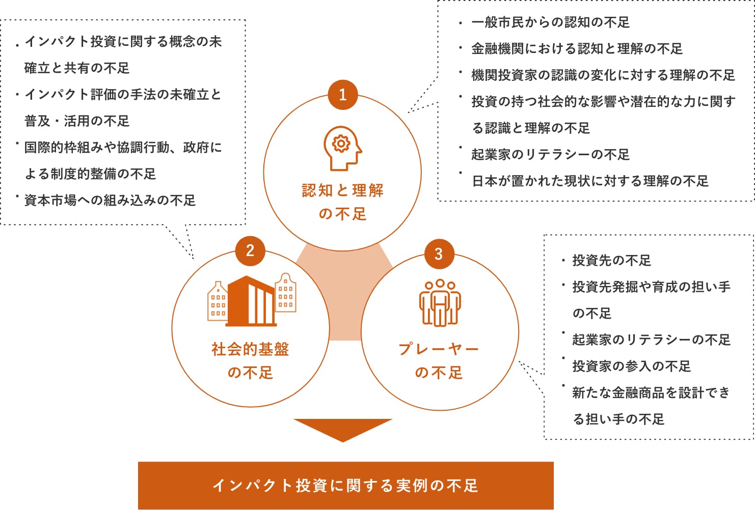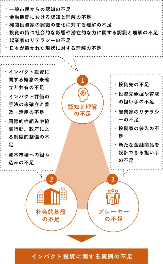 日本のインパクト投資をめぐる課題としては、①認知と理解の不足、②プレーヤーの不足、③社会的基盤の不足、という「3つの不足」が挙げられます。